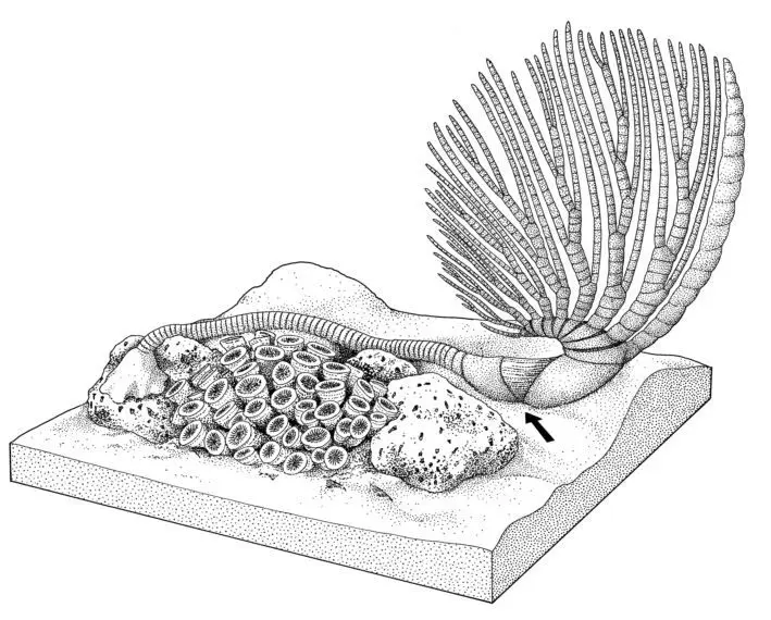 Crinoids can very basically be described as upside-down starfish with a stems. The stem of a crinoid extends down from what would be the top of a starfish, leaving the mouth of the organism opening skyward, with the arms splayed out. However, crinoid arms look articulated and feathery. The stalk extends down from the aboral surface of the calyx. The stalk column has holdfasts which attach the animal to substrate.